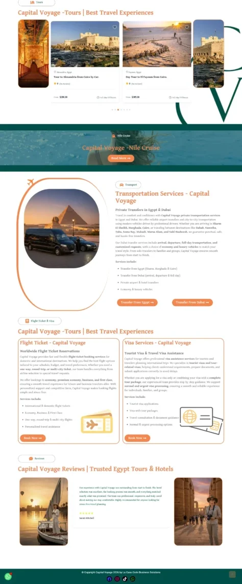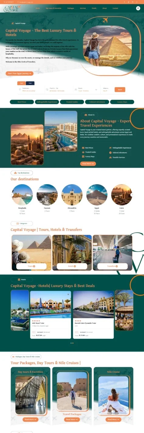 Capital Voyage is a high-end, Category (A) licensed travel agency that has been operating for nearly two decades. With a strategic presence in both Egypt and Dubai, the agency bridges the tourism markets of the Nile and the Gulf, offering luxury travel experiences backed by direct hotel partnerships and a private fleet of vehicles.