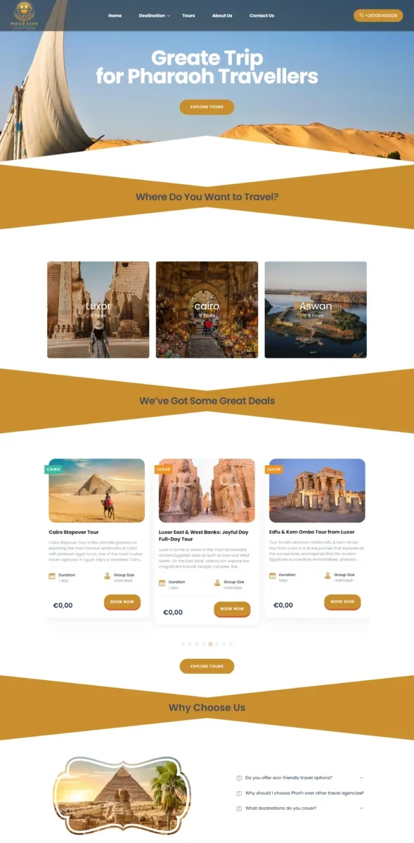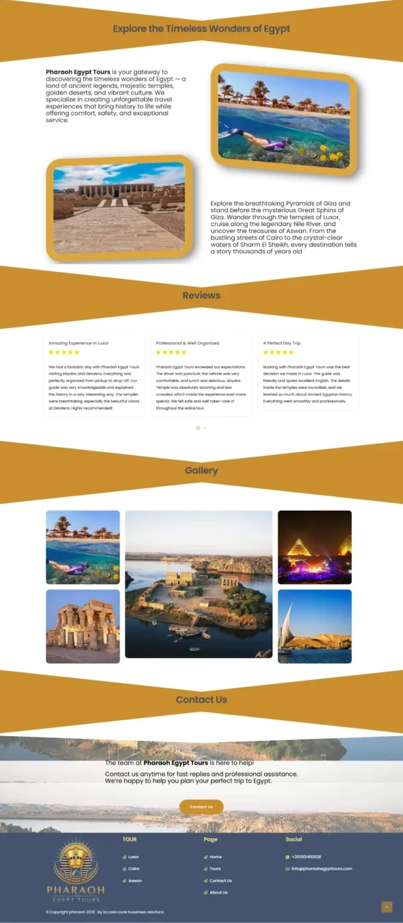 Pharaoh Egypt Tours is a professional travel agency that specializes in providing immersive and high-quality tours across Egypt’s most significant historical sites. The agency focuses on delivering “Pharaoh-level” service, combining historical expertise with modern comfort and personalized care.