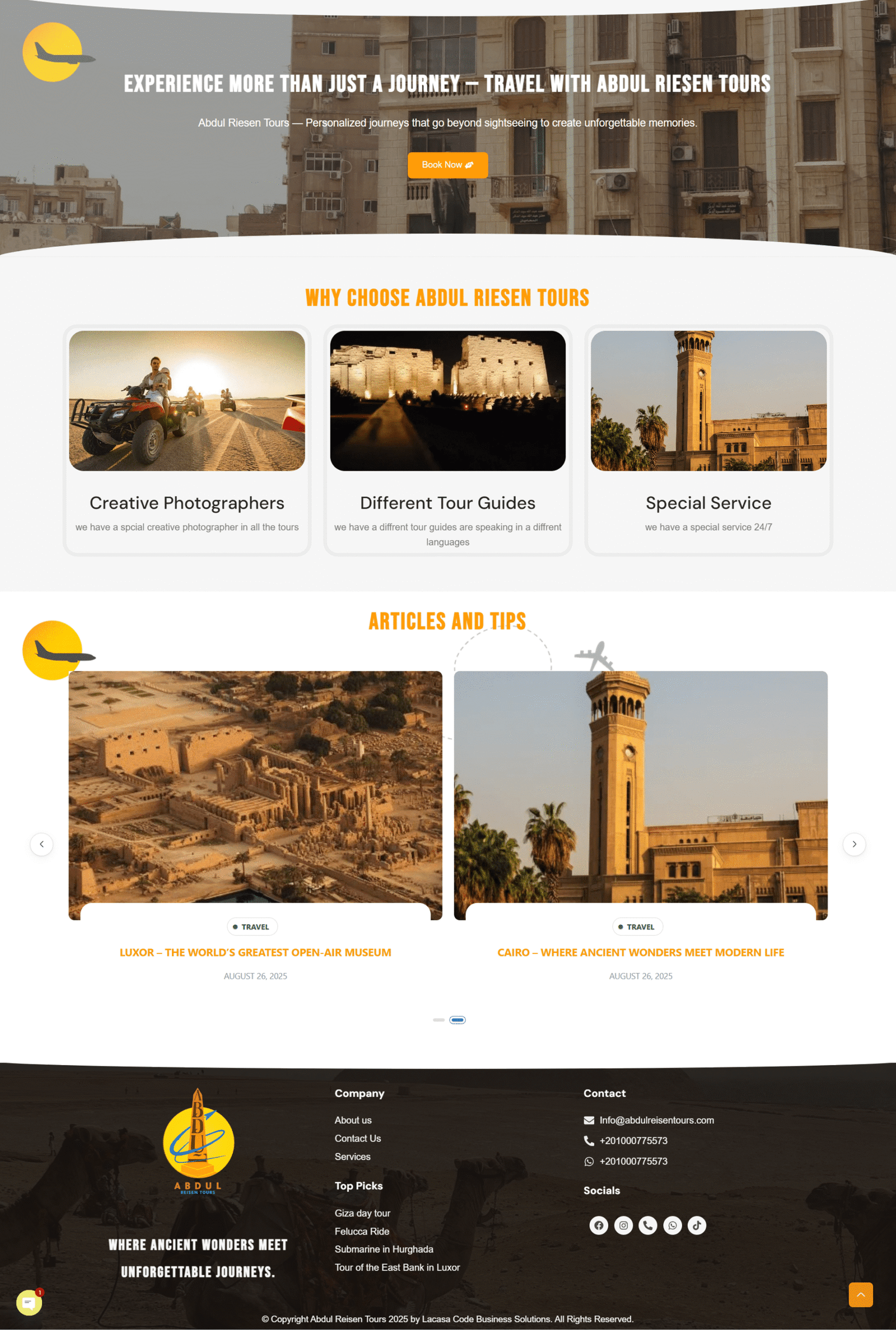 Abdul Reisen Tours is a travel company specializing in providing a wide range of excursions and tours across major Egyptian destinations, with a particular focus on catering to international travelers, especially those from European markets. The company specializes in organizing diverse travel programs that include cultural tours to historical landmarks in Luxor and Cairo, in addition to safari trips and exciting marine activities in Hurghada and Sharm El Sheikh.