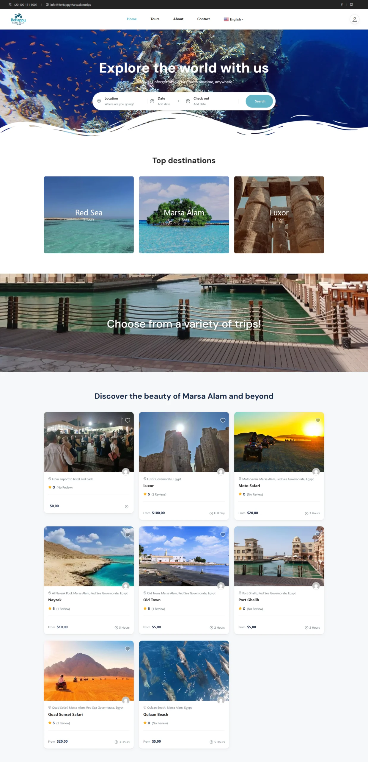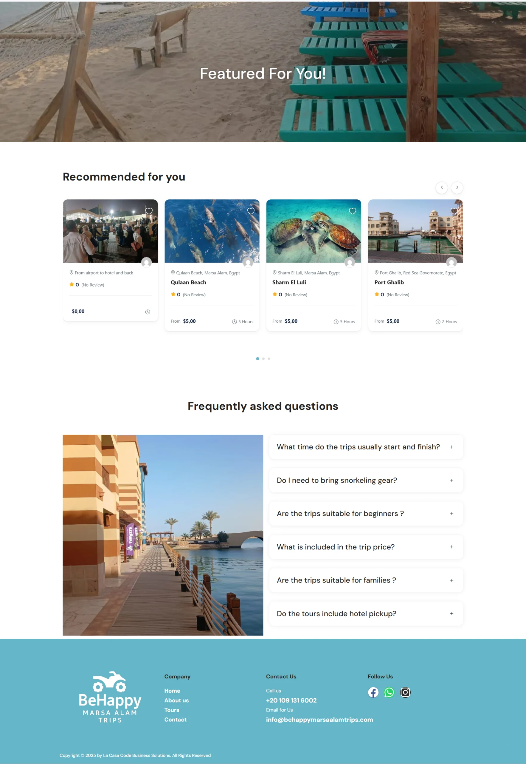Be Happy Trips is a vibrant travel website developed by La Casa Code to deliver a refreshing and reliable digital presence in the tourism industry. The platform focuses on offering exceptional travel experiences, with most tours centered around the breathtaking destination of Marsa Alam — known for its crystal-clear waters, coral reefs, and serene beaches.