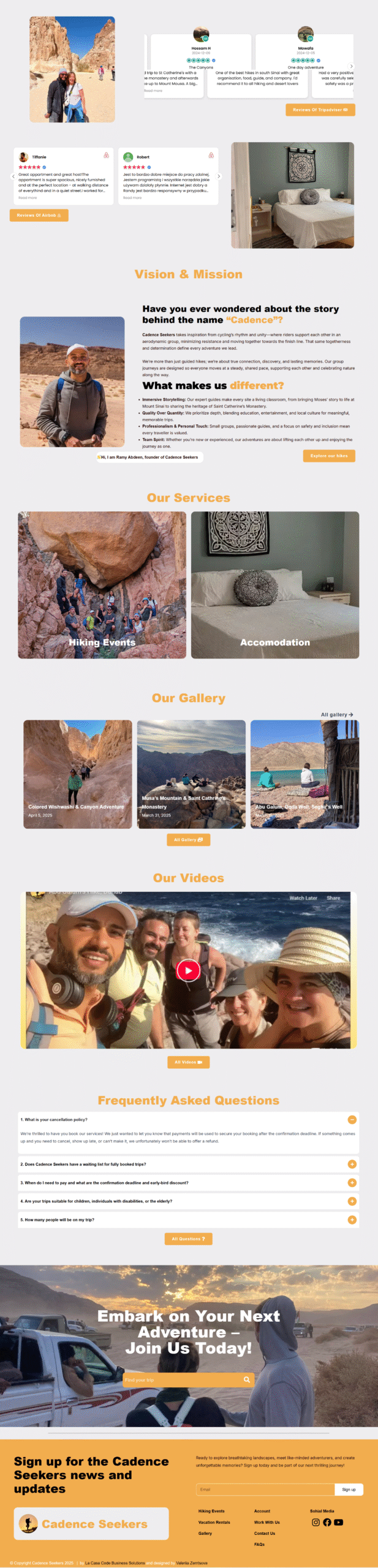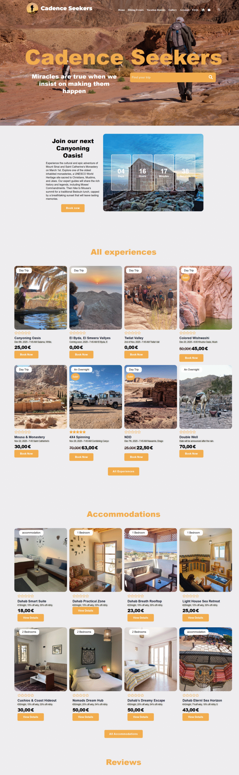 Cadence Seekers is a leading company specializing in organizing hiking and adventure trips in the heart of the Egyptian Sinai Peninsula. The company focuses on delivering immersive exploratory experiences that emphasize cultural interaction and connection with nature, targeting travelers seeking both a physical challenge and historical insights. Their programs include detailed tours to ascend Mount Sinai (Gabal Musa), visit Saint Catherine’s Monastery, and explore pristine valleys and natural sites like the Colored Wishwashi Oasis, in addition to arranging accommodations in areas such as Dahab.