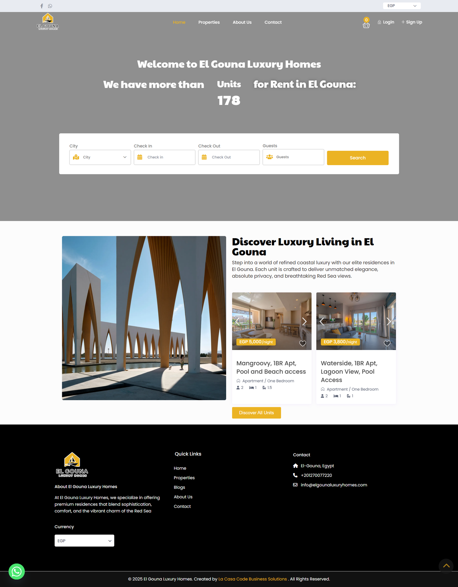 El Gouna Luxury Homes is the premier destination for investors and individuals seeking exclusive luxury properties in the globally renowned coastal town of El Gouna on the Red Sea. The company specializes in showcasing the finest villas, apartments, and homes available for sale and rent, featuring sophisticated architectural designs and stunning views of the lagoons, marina, or beachfront. El Gouna Luxury Homes provides comprehensive services, starting from real estate consultation, facilitating the purchase or rental process, and extending to property management, ensuring a seamless and distinctive ownership experience in this exclusive Egyptian resort.